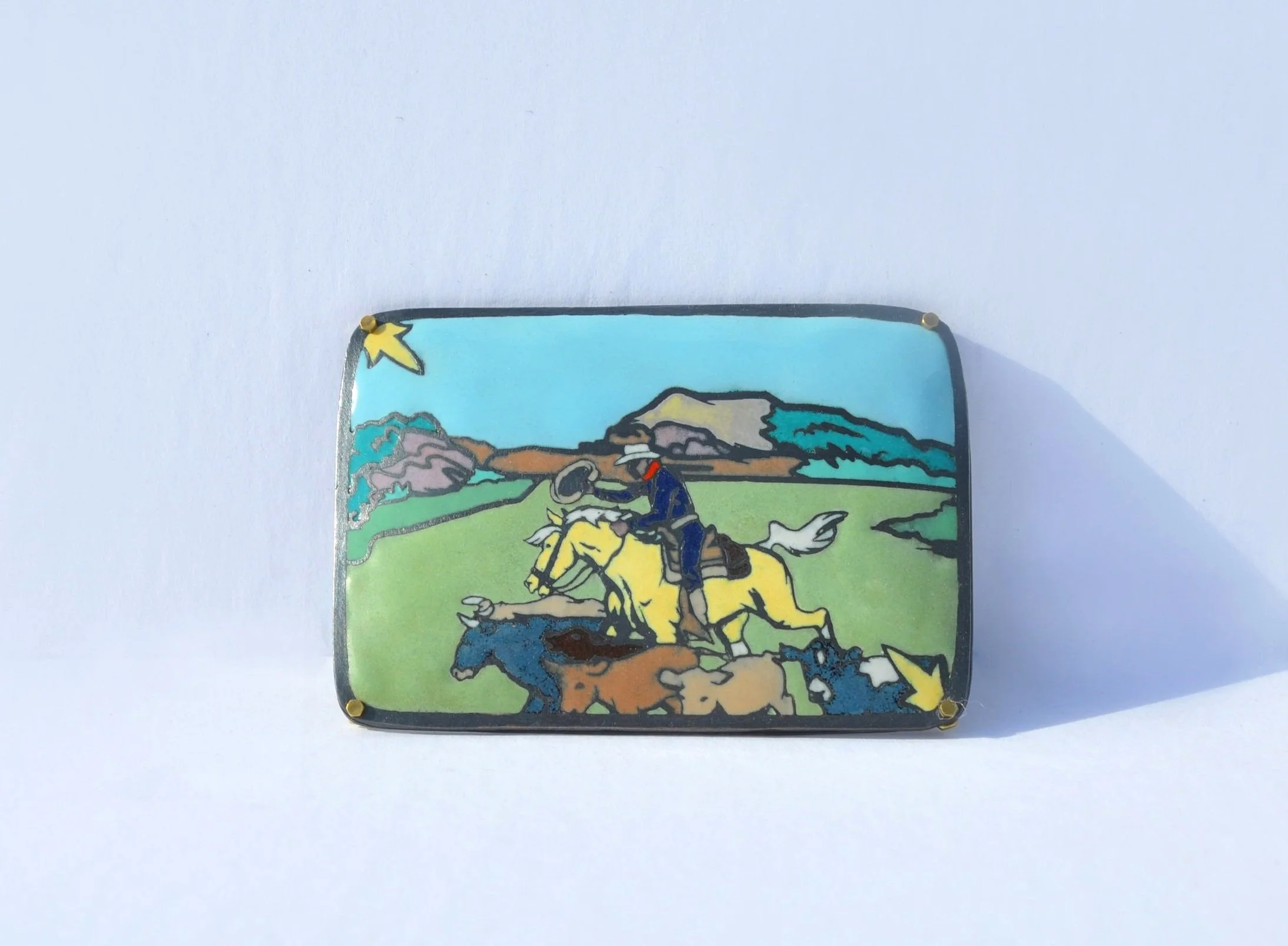 Champlevé enamel on copper, silver foil, silver and copper wire. Photo by Sol Waterman. 2025.