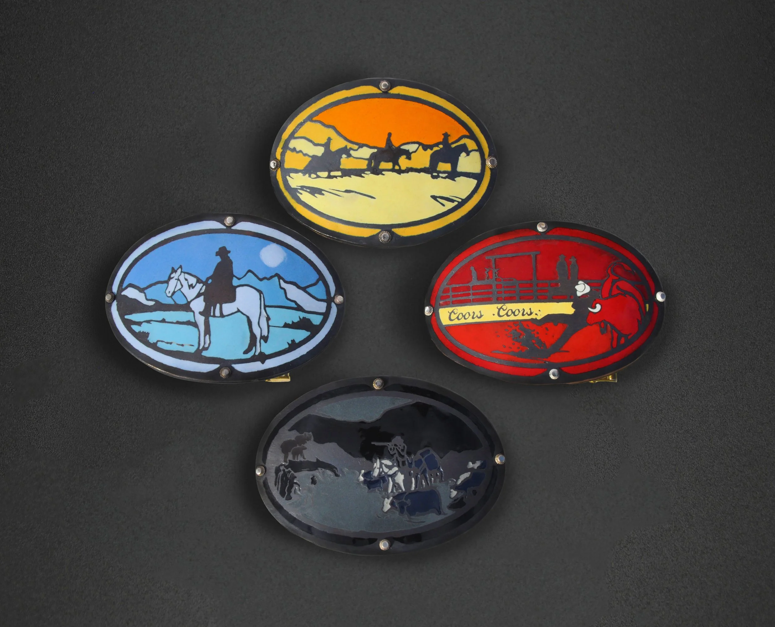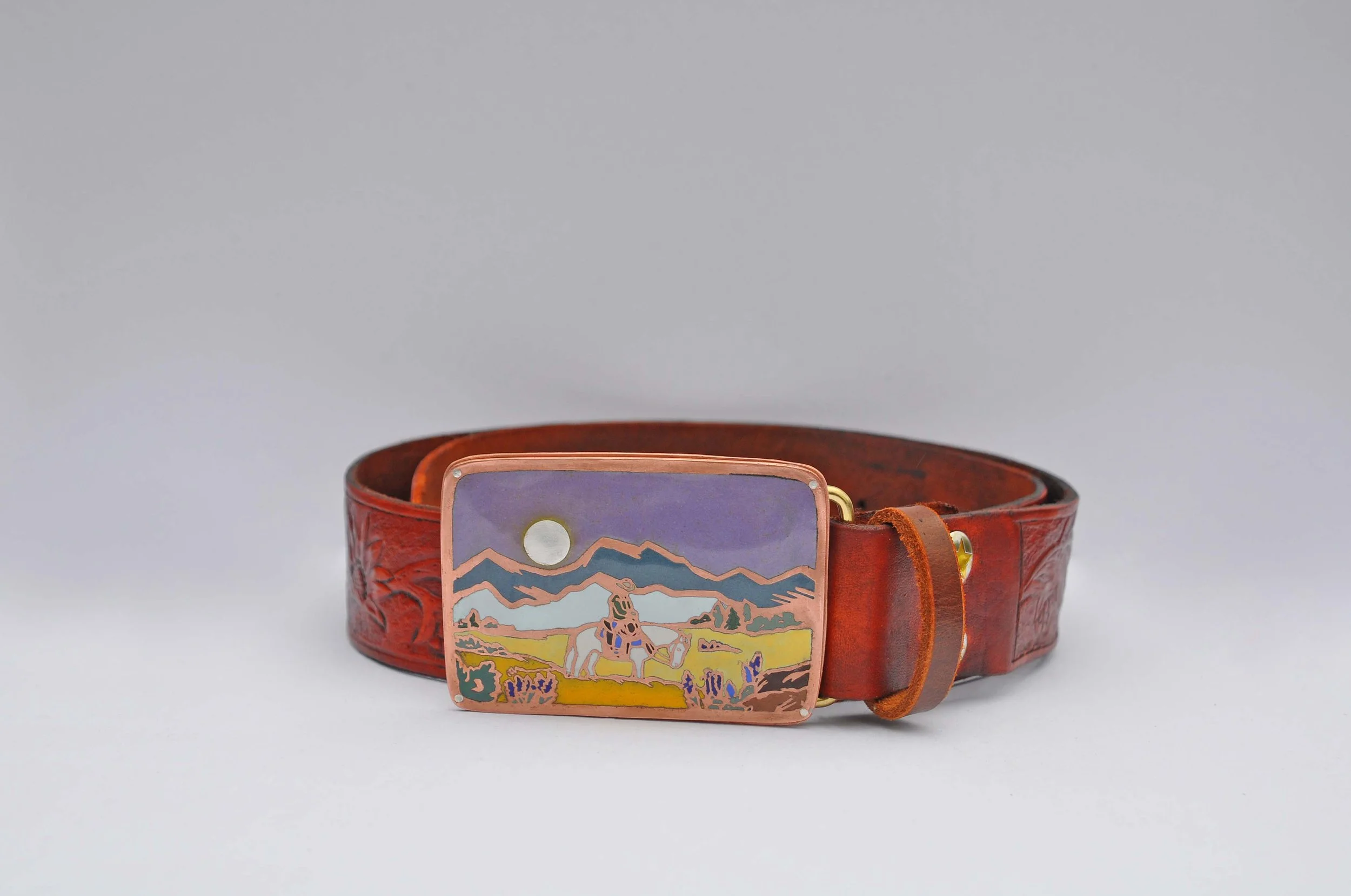 Champlevé enamel on copper, brass findings, silver findings, hand tooled leather belt
